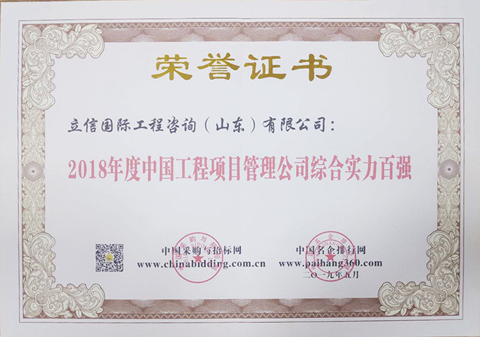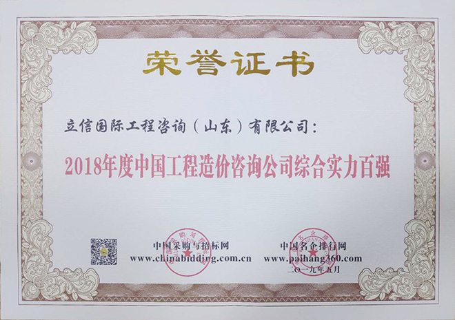 2019年5月,在“2019第13屆全國招投標領域年度聚焦暨全過程工程咨詢機構評價推介”活動中,立信國際工程咨詢(山東)有限公司獲得如下榮譽: 2018年度中國全過程工程咨詢公司綜合實力百強 2018年度中國工程造價咨詢公司綜合實力百強 2018年度中國工程項目管理公司綜合實力百強 2018年度中國全過程工程咨詢BIM咨詢公司綜合實力50強