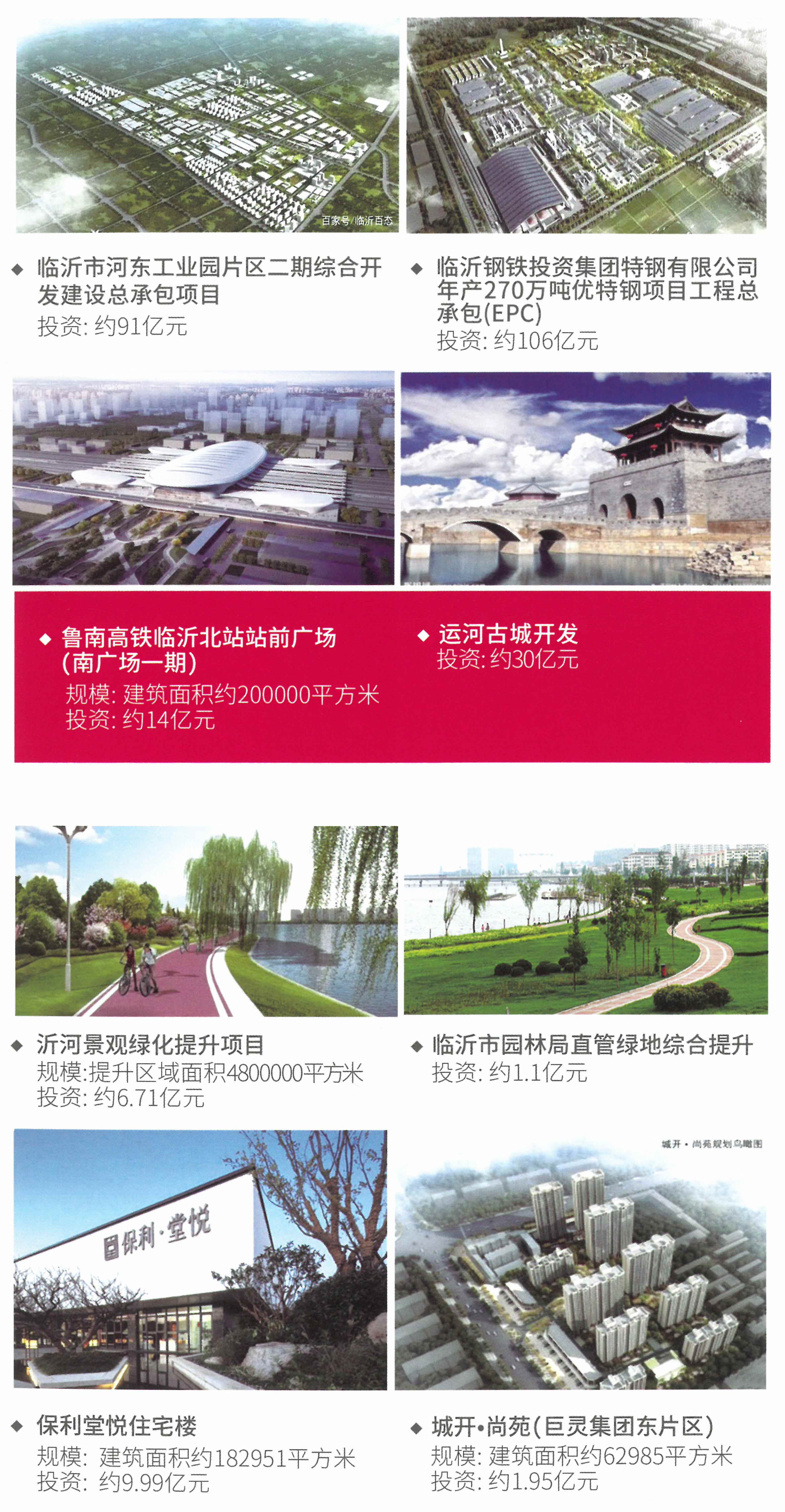 ·臨沂鋼鐵投資集團特鋼有限公司年產(chǎn)270萬噸優(yōu)特鋼項目工程總承包(EPC) ·臨沂市河東工業(yè)園片區(qū)二期綜合開發(fā)建設(shè)總承包項目 ·城開·尚苑(巨靈集團東片區(qū)) ·沂河景觀綠化提升 ·保利堂悅住宅樓 ·陷泥河綜合整治 ·融創(chuàng)集團融創(chuàng)御園 ·臨沭縣創(chuàng)業(yè)大廈建設(shè)工程PPP ·魯南高鐵臨沂北站站前廣場(南廣場一期) ·金域華府 ·運河古城開發(fā) ·房源·銀河灣3號院