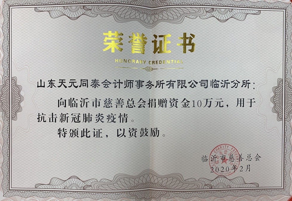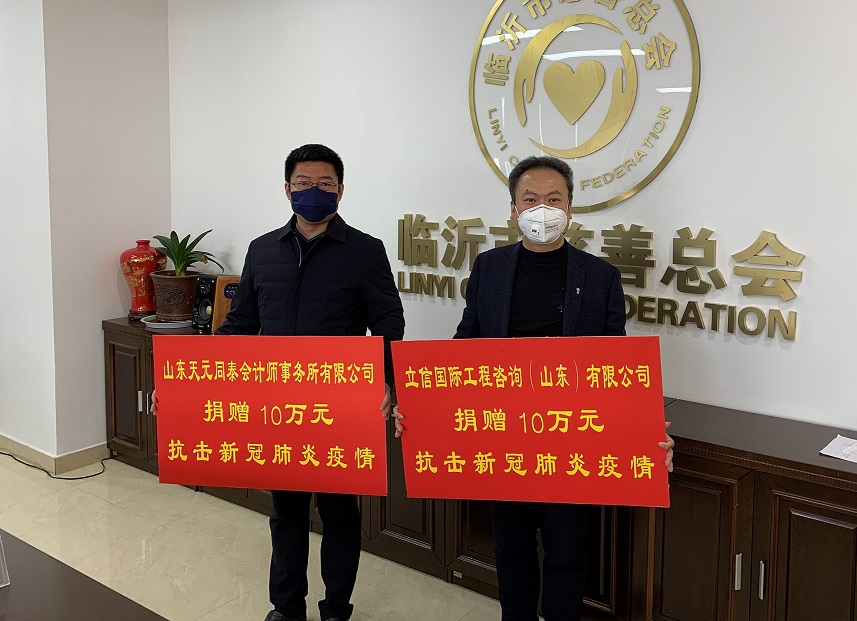 防控疫情,人人有責(zé)。在抗擊新冠肺炎關(guān)鍵時(shí)期,全體同泰人與全國(guó)人民同呼吸、共命運(yùn),特向臨沂市慈善總會(huì)捐款專(zhuān)項(xiàng)用于防控新冠肺炎,以表達(dá)同泰人疫情面前共擔(dān)當(dāng)?shù)臎Q心和信心。其中山東天元同泰會(huì)計(jì)師事務(wù)所臨沂分所捐款10萬(wàn)元,立信國(guó)際工程咨詢(山東)有限公司捐款10萬(wàn)元,合計(jì)20萬(wàn)元整。 用愛(ài)戰(zhàn)疫,共克時(shí)艱?!巴庇米约旱男袆?dòng)參與到這場(chǎng)戰(zhàn)役中,以聚沙成塔、聚光為星的信念為一線防疫工作提供支持。我們堅(jiān)信在各級(jí)黨委、政府的堅(jiān)強(qiáng)領(lǐng)導(dǎo)下,全國(guó)人民萬(wàn)眾一心、眾志成城,我們有信心、有決心、有能力一定能夠打贏這次疫情防控阻擊戰(zhàn)! 武漢加油!中國(guó)加油!