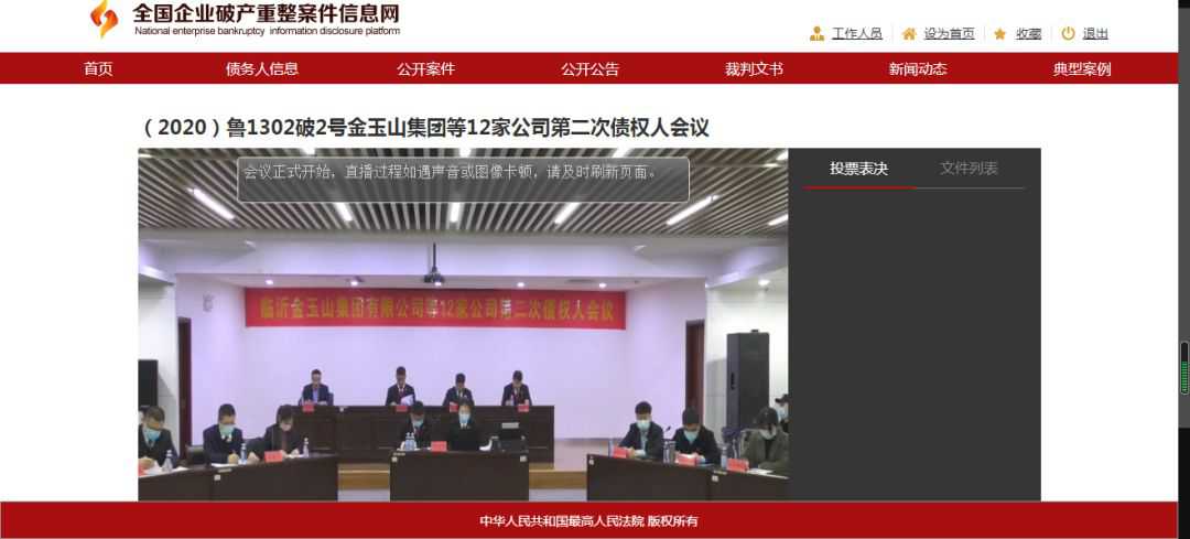 會議開始后,由臨沂市蘭山區(qū)人民法院合議庭書記員朱靜怡宣讀會場紀(jì)律,會議議程第一項:合議庭介紹案件進(jìn)展情況;第二項:管理人代表尹昌鳳作《管理人履職工作報告》;第三項:審計機構(gòu)代表李敏作《審計工作情況說明》;第四項:評估機構(gòu)代表趙常鑫作《評估工作情況說明》;第五項:管理人代表孔鵬作《關(guān)于補充申報債權(quán)核查的報告》;第六項:管理人代表孔鵬公布《臨沂金玉山集團有限公司等十二家公司合并重整計劃(草案)》并進(jìn)行介紹;第七項:管理人代表范昌龍宣讀《債權(quán)人會議表決規(guī)則》;第八項:合議庭宣讀臨時表決權(quán)決定書;第九項:山東省臨沂市沂蒙公證處宣讀第二次債權(quán)人會議線下表決結(jié)果公證情況;第十項:未表決的債權(quán)人進(jìn)行線上表決并由管理人統(tǒng)計表決結(jié)果;第十一項:公布表決結(jié)果,本次會議上,全部債權(quán)組表決通過重整計劃草案。歷時一年,臨沂金玉山集團有限公司等十二家重整成功!